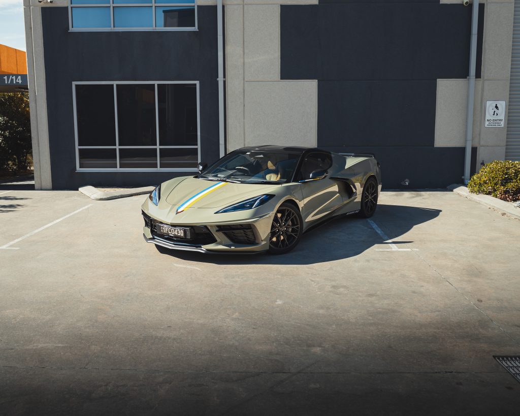 The C8 Corvette redefines what an American performance car can be. With its mid-engine layout, aggressive styling, and track-ready performance, it’s a true game-changer. Under the bonnet sits a naturally aspirated 6.2L V8, pushing out 495 horsepower and 637Nm of torque. Paired with an 8-speed dual-clutch transmission, this rocket launches from 0-100 km/h in just 3.4 seconds. The car also stands out thanks to our iconic super-gloss khaki custom wrap by Custom Wraps and Tinting. If that’s not your thing, under the wrap is Chevy’s signature “Riptide” blue metallic paint.