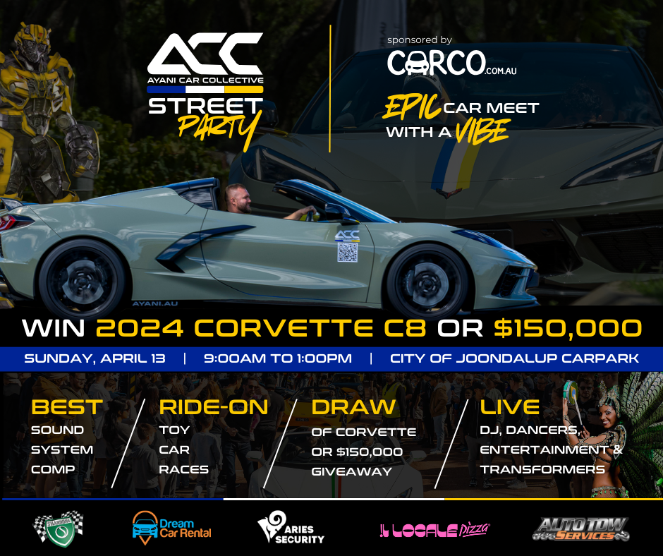 On April 13, 2025, the City of Joondalup Carpark will transform into a vibrant festival of speed, style, and sound at the ACC Street Party sponsored by Carco WA. Hosted by Ayani Car Collective (ACC), known for bringing together the community through unique and lively car events, this meet promises to be a highlight in Perth’s event calendar for all!
